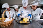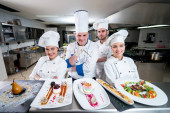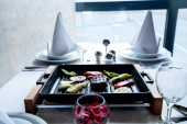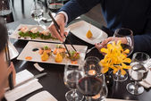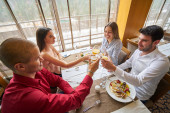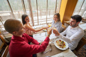 żywności, Boże Narodzenie, święta i ludzi pojęcie - uśmiechający się para danie jedzenie w restauracji