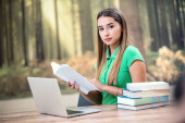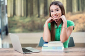Młoda kobieta przy użyciu komputera przenośnego i inteligentny telefon. Dziewczyna student piękny pracy na laptopie i studia