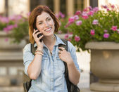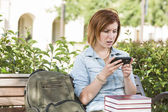 uśmiechnięta młoda kobieta gospodarstwa inteligentny telefon komórkowy biały