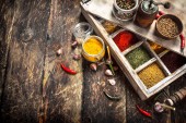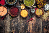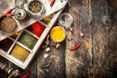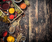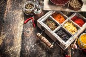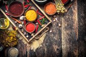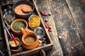 Zdjęcie "Różnych mielonych przypraw i ziół w stary Taca." może być wykorzystywane do celów osobistych i komercyjnych zgodnie z warunkami zakupionej licencji Royalty-free. Obraz jest dostępny do pobrania w jakości wysokiej rozdzielczości do 5760x3840.