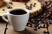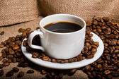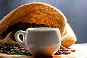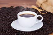 białe filiżanka kawy na desce z rozrzuconych ziaren kawy