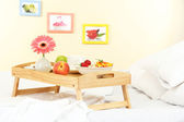 Drewniana taca z lekkim śniadaniem na łóżku