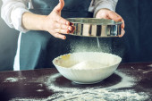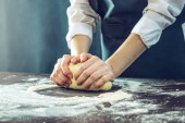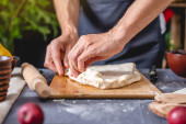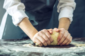 Szef kuchni w czarny fartuszek sprawia, że ciasto do pizzy z rąk na stole