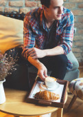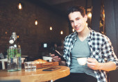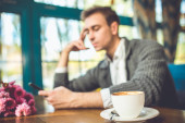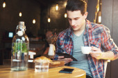 Młody mężczyzna siedząc w kawiarni, przy użyciu tabletu, picia kawy