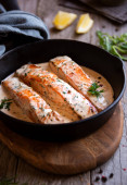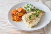 Zdjęcie "Pieczony filet z łososia z puree Pasternak, Sałatka z pomidorów i pietruszka dekorować, zdrowe odżywianie posiłek na talerzu biały i niebieski serwetka, wysokiej kąt widoku z góry, miejsce" może być wykorzystywane do celów osobistych i komercyjnych zgodnie z warunkami zakupionej licencji Royalty-free. Obraz jest dostępny do pobrania w jakości wysokiej rozdzielczości do 5760x3840.