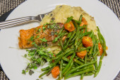 Pieczony filet z łososia z puree Pasternak, Sałatka z pomidorów i pietruszka dekorować, zdrowe odżywianie posiłek na talerzu biały i niebieski serwetka, wysokiej kąt widoku z góry, miejsce