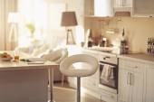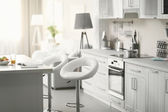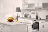 Nowoczesna kuchnia wnętrz z drewnianym stołem i kuchenka mikrofalowa