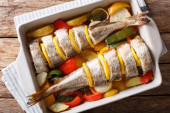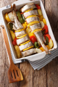 Dorsz pieczony z warzywami w naczyniu do pieczenia z bliska. Ho