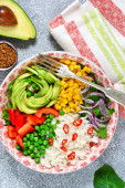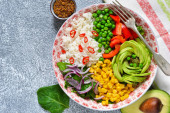 Zdjęcie "Płyta z sałatką, ryżu, kukurydzy i awokado." może być wykorzystywane do celów osobistych i komercyjnych zgodnie z warunkami zakupionej licencji Royalty-free. Obraz jest dostępny do pobrania w jakości wysokiej rozdzielczości do 5760x3840.