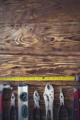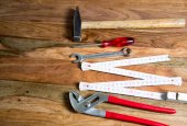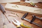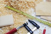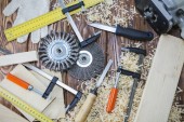 Władca stolarz narzędzie pracy, dłuta, ołówek, trociny i wióry.