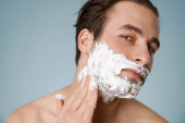 Portret szczęśliwy Man zastosowaniu pianki do golenia z bliska