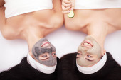 Domowe spa. Dwie kobiety, trzymając kawałki ogórka na ich twarzach ly