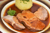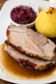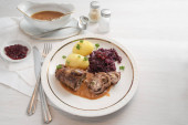 Zdjęcie "Rolada wołowa z czerwona kapusta, ziemniaki i sos, mięso niemiecki roll nadziewane ogórki i boczek, zbliżenie" może być wykorzystywane do celów osobistych i komercyjnych zgodnie z warunkami zakupionej licencji Royalty-free. Obraz jest dostępny do pobrania w jakości wysokiej rozdzielczości do 5760x3840.