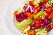 różnych Sałatka mix świeżych liści z sałata radicchio i rakiet w płycie na ciemnym tle drewnianych