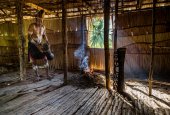 Dolina Baliem, Papua Zachodnia, Indonezja, 4 czerwca 2016: Wioski plemienia Dugum Dani. Stara kobieta z plemienia Dugum Dani gotuje jedzenie i używa metody piekarnik ziemi gotowania świnia. Papua Zachodnia. Nowej Gwinei wyspie.