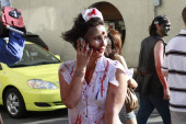 Vancouver - 21 sierpnia 2010: Ludzie przebrany parady zombie na ulicy, podczas spaceru zombie w Vancouver Downtown