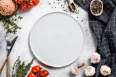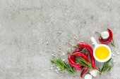 Zdjęcie "Kulinarne tło z pusty biały deska gotowanie i miejsca na tekst, płaskie świeckich skład oleju, Red Hot chili peppers, rozmaryn, cebuli i przypraw na stole kamień powierzchni, top view" może być wykorzystywane do celów osobistych i komercyjnych zgodnie z warunkami zakupionej licencji Royalty-free. Obraz jest dostępny do pobrania w jakości wysokiej rozdzielczości do 5760x3840.