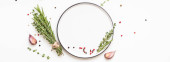 Kulinarne tło z pusty biały deska gotowanie i miejsca na tekst, płaskie świeckich skład oleju, Red Hot chili peppers, rozmaryn, cebuli i przypraw na stole kamień powierzchni, top view