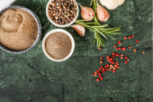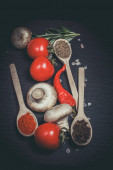 Widok z góry surowego ryżu w misce z grzybów i pomidorów na białej powierzchni