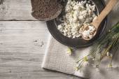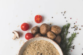 miska ryżu smaczne z grzybami i butelkę soi sauceon czarnym blatem
