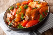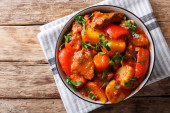 Duszona wołowina z warzywami w sosie na ostro w misce na stole.