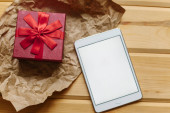 Zdjęcie "Koncepcja obchodzi zdarzenia. Prezent na ekranie tabletu, który leży na czerwonym tle." może być wykorzystywane do celów osobistych i komercyjnych zgodnie z warunkami zakupionej licencji Royalty-free. Obraz jest dostępny do pobrania w jakości wysokiej rozdzielczości do 5760x3840.