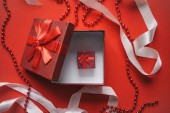 Koncepcja obchodzi zdarzenia. Prezent na ekranie tabletu, który leży na czerwonym tle.