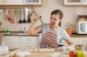 Zły szalony kaukaski młody człowiek w fartuch, brązowy shirt siedzi