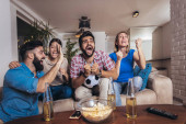 Grupa przyjaciół grająca w karaoke w domu. Koncepcja przyjaźni, rozrywki domowej i ludzi