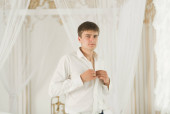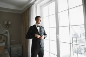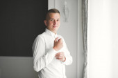 Piękny mężczyzna, pan młody pozowanie i przygotowanie do ślubu