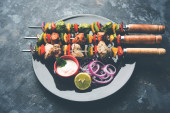 RAW kebab z mięsa na tle drewnianych z warzywami. Widok z góry. Ilość wolnego miejsca dla tekstu.