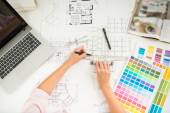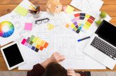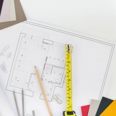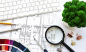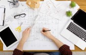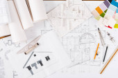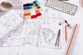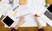 Projekt architektoniczny, narzędzia inżynierskie na stole.