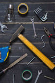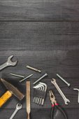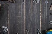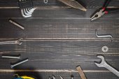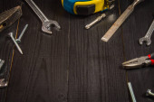 Stolarka narzędzia na ciemny drewniany stół. Miejsce dla tekstu. Koncepcja na dzień ojca.