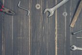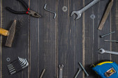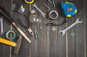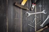 Zdjęcie "Stolarka narzędzia na ciemny drewniany stół. Miejsce dla tekstu. Koncepcja na dzień ojca." może być wykorzystywane do celów osobistych i komercyjnych zgodnie z warunkami zakupionej licencji Royalty-free. Obraz jest dostępny do pobrania w jakości wysokiej rozdzielczości do 5760x3840.