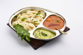 Masala dosa z sabzi chutney i sambar i ziemniaków. Kształt stożka, trójkąta lub rolki, Selektywny fokus