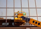 Pusty bezpieczeństwa strażacki drabina kosz na dźwig w pobliżu budynku z bliska