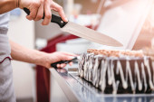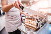 Kelnerka, organizowanie ciasto w ladzie chłodniczej w cukierni