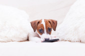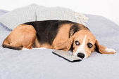 Golden retriever pies leży na kanapie z pilota telewizora