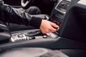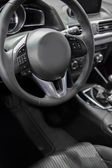 Luksusowe wnętrze samochodu. Kierownica, dźwignia zmiany biegów i deska rozdzielcza.