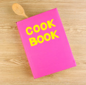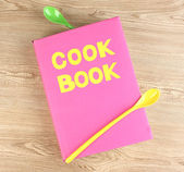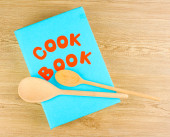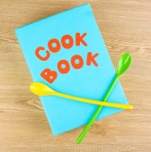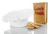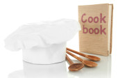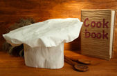 Kucharski kapelusik z łyżki i książka kucharska na stole na brązowym tle