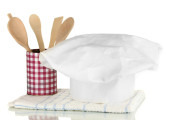 Kucharski kapelusik z łyżki i ostrze na białym tle