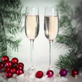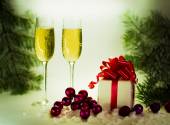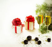 dwa kieliszki z szampanem i pudełka z prezentami na Boże Narodzenie b