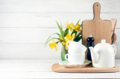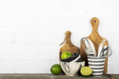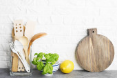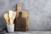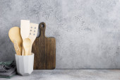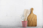 Deska do krojenia narzędzia, oliwek kuchnia na półce kuchnia przeciwko białym murem. Selektywny fokus