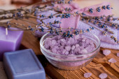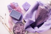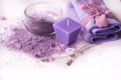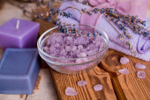 masaż Spa ustawienie, lawenda produktu, olej na drewniane tła