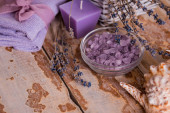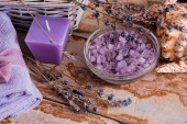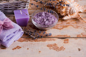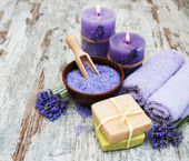 masaż Spa ustawienie, lawenda produktu, olej na drewniane tła