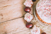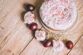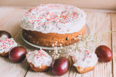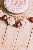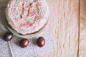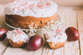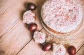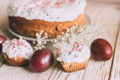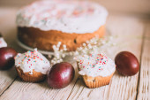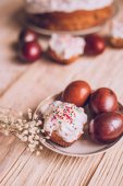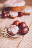 Stół wielkanocny z tradycyjnego ciasta wielkanocne i pisanki z kwitnąca gałąź drzewa