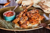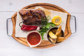 Widok z góry na danie z żebra pieczone jagnię z pomidorami i sosem.