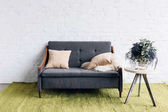 nowoczesny salon wnętrza z przytulnej kanapie i kwiat w puli na stół, makieta koncepcja