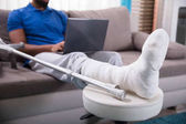 Młody mężczyzna ze złamaną nogą za pomocą kul, aby wstać z sofą
