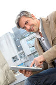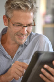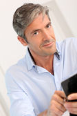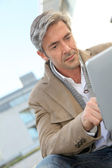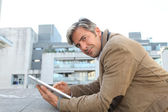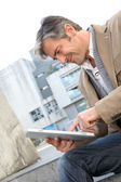 przystojny facet w mieście za pomocą elektronicznego tabletki